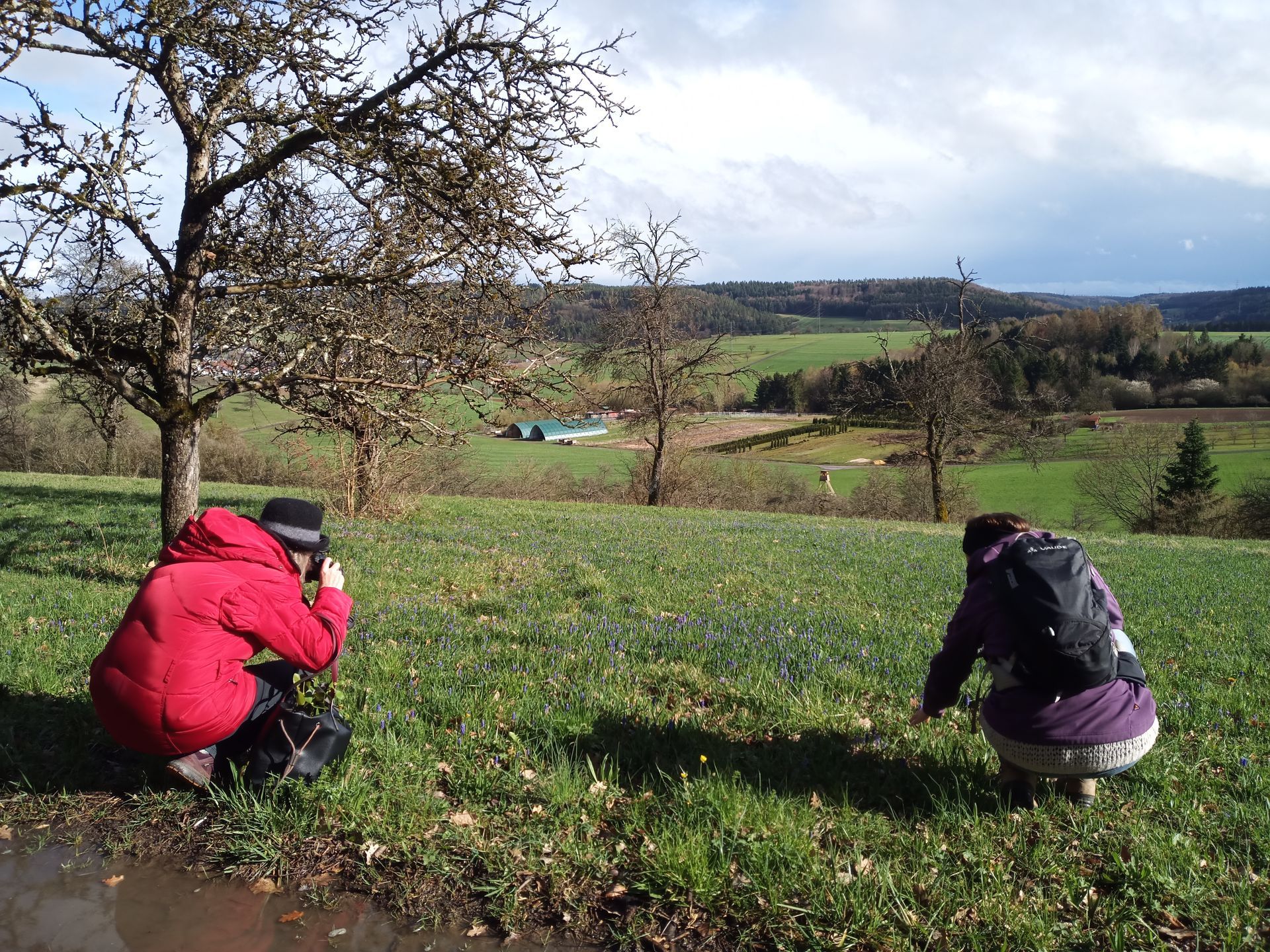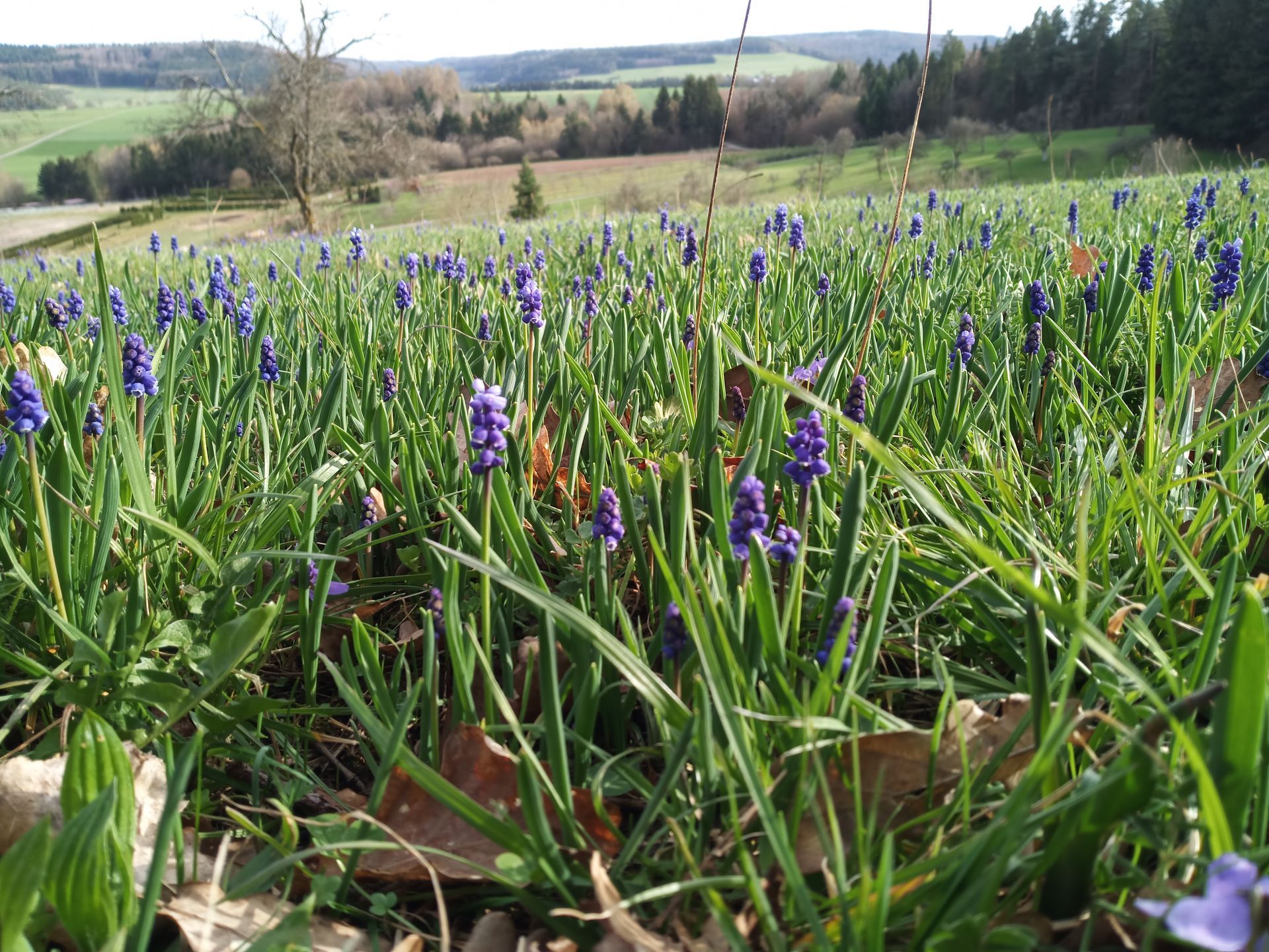 Auf einer Streuobstwiese zeigte Sie den Teilnehmern ein wahres Kleinod, auf dieser naturbelassenen Magerwiese hat sich die Traubenhyazinthe (lat.: Muscari) weit ausgebreitet und bildet einen richtigen blauen Blütenteppich. Ähnlich wie bei der Krokusblüte in Bad Teinach-Zavelstein ist davon auszugehen, dass eine mitgebrachte Blumenzwiebel gepflanzt wurde und sich hier, über die Jahre, ausgewildert und verbreitet hat. Es fiel allen schwer den Blick von diesem Meer an Traubenhyazinthen zu lassen, wenn man aber genauer hinsah, konnte man schon etliche andere Pflanzen ausmachen, so z.B. Wiesensalbei, Skabiose, Wegeriche, Veilchen, Schlüsselblumen, Esparsette, Schafgarbe, Sauerampfer… Eine wunderbar vielfältige Magerwiese, die Lebensraum, also Biotop, für eine Vielzahl von Insekten, Vögeln und Säugetieren ist.